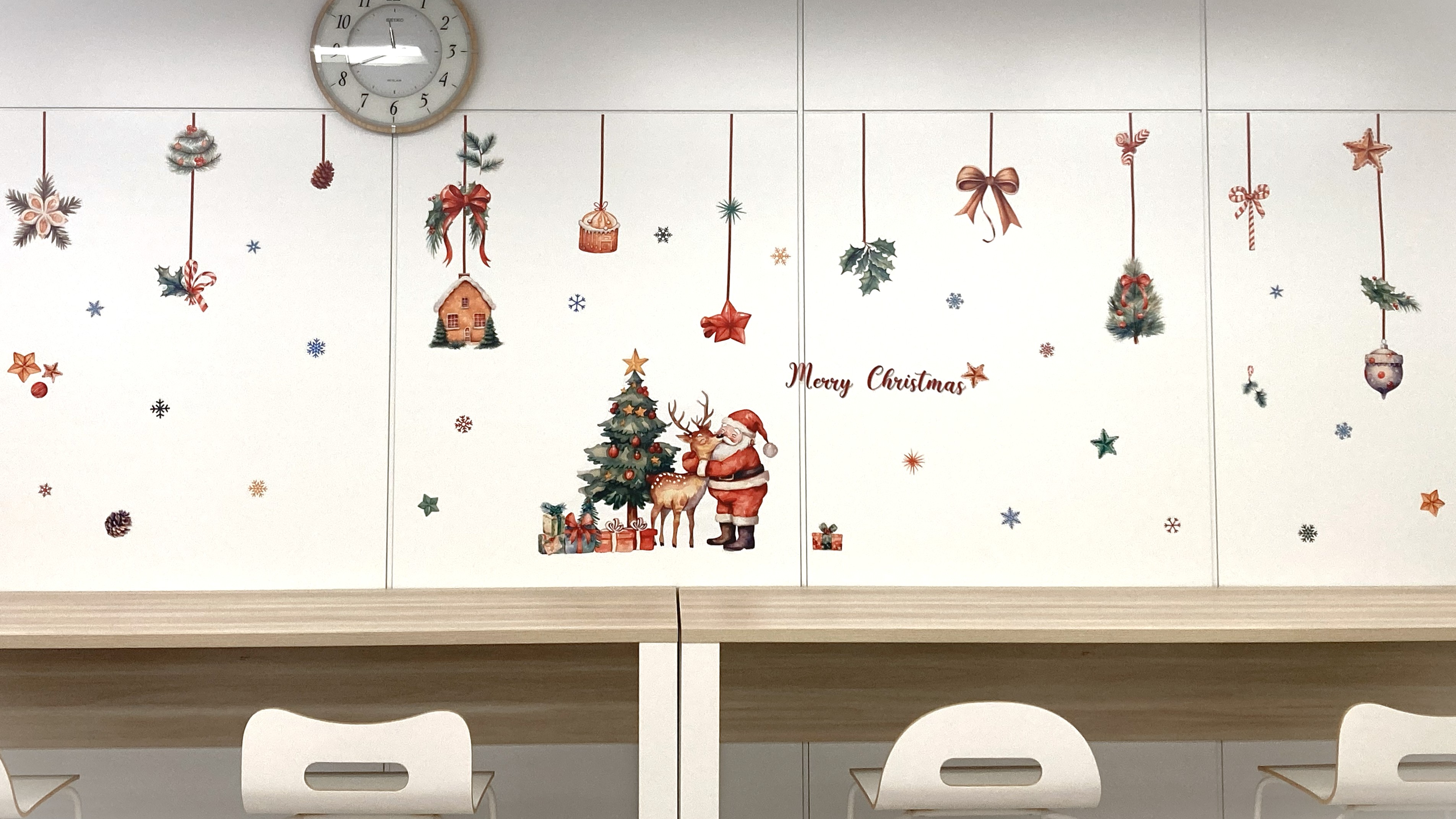 壁面にもクリスマスモチーフのデコレーションをあしらい、思わずほっとするような温かい空間に仕上がっています!